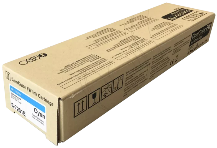RISO ComColor FW ink Cyan Charakterystyka Nowy rodzaj zastosowanego atramentu oraz poprawiony algorytm druku pozwala na wydruk bardziej nasyconych kolorów oraz obniża czas schnięcia tuszu, co pozwala zwiększyć szybkość pracy urządzeń. Atrament nie powoduje efektu pofalowania struktury papieru, nie rozmazuje się i ma właściwości wodoodporne. RISO ComColor Fw ink Cyan