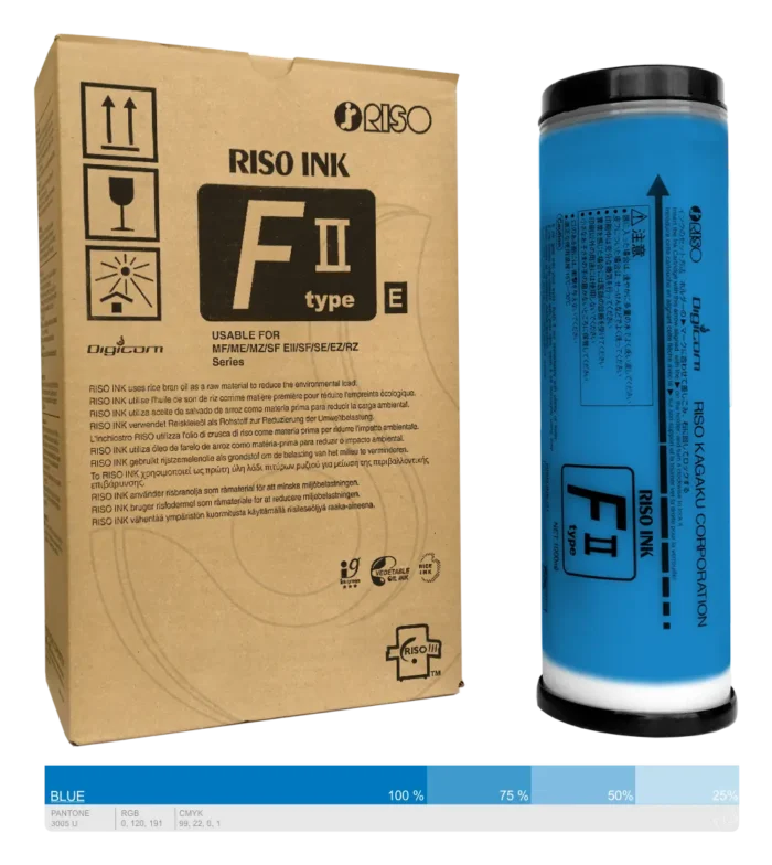 RISO farba FII type BLUE PANTONE KOLOR 3005 U Uniwersalność RISO Uniwersalna farba kolor FII do wszystkich modeli RISO. Ekologia Nowy skład farby oparty na oleju z otrąb ryżowych z dodatkiem pigmentu to kolejny krok firmy RISO w dążeniu do wyeliminowaniu przy produkcji sztucznych związków chemicznych i zastępowania ich komponentami