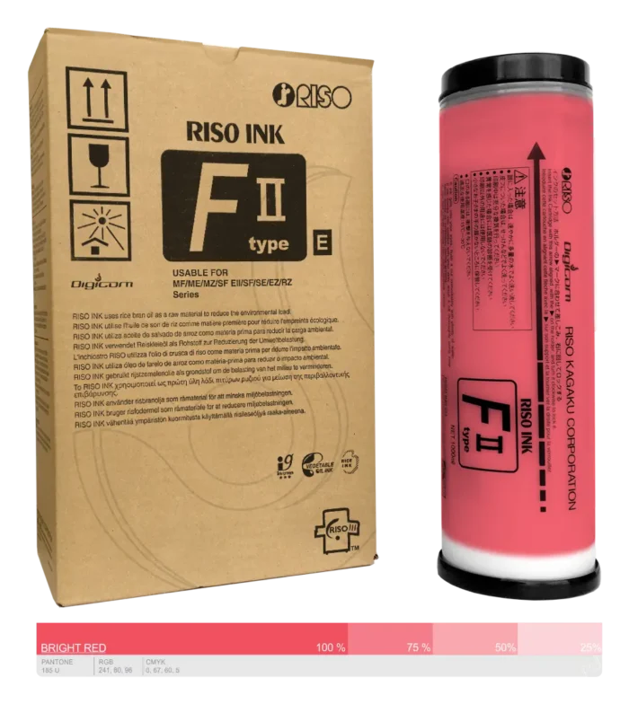 RISO farba FII type BRIGHT RED PANTONE KOLOR 185 U Uniwersalność RISO Uniwersalna farba kolor FII do wszystkich modeli RISO. Ekologia Nowy skład farby oparty na oleju z otrąb ryżowych z dodatkiem pigmentu to kolejny krok firmy RISO w dążeniu do wyeliminowaniu przy produkcji sztucznych związków chemicznych i zastępowania ich