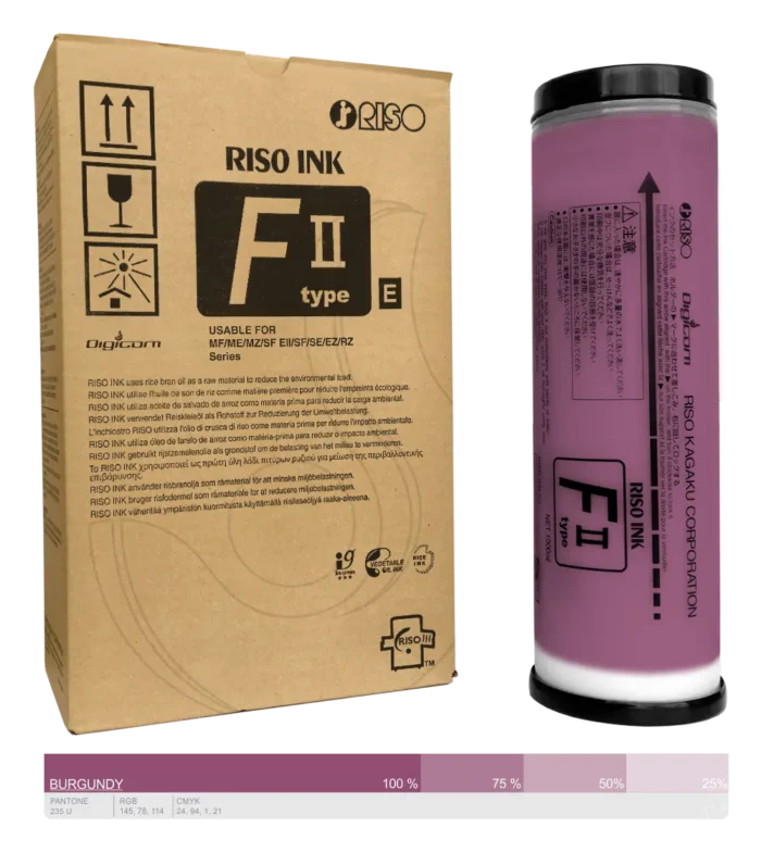 RISO farba FII type BURGUNDY PANTONE KOLOR 235 U Uniwersalność RISO Uniwersalna farba kolor FII do wszystkich modeli RISO. Ekologia Nowy skład farby oparty na oleju z otrąb ryżowych z dodatkiem pigmentu to kolejny krok firmy RISO w dążeniu do wyeliminowaniu przy produkcji sztucznych związków chemicznych i zastępowania ich komponentami