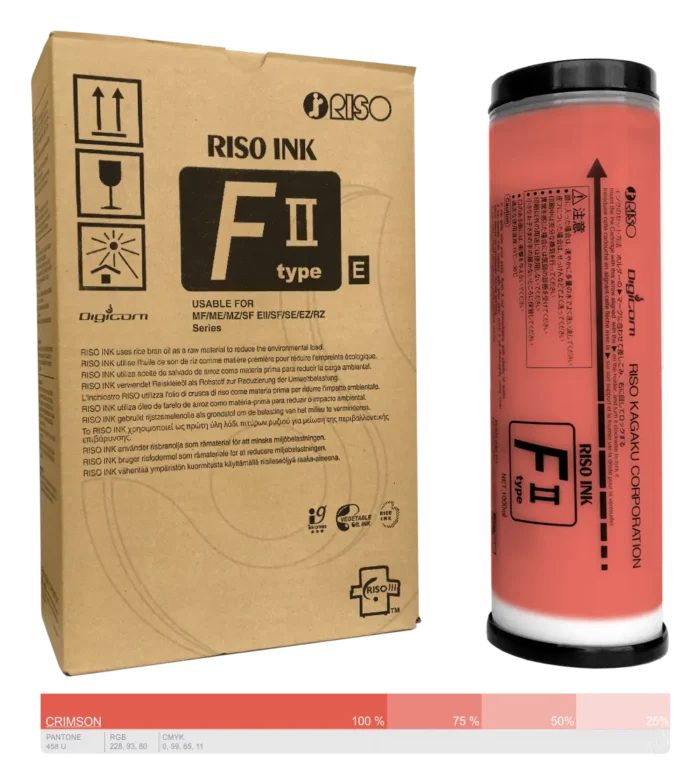 RISO farba FII type CRIMSON PANTONE KOLOR 458 U Uniwersalność RISO Uniwersalna farba kolor FII do wszystkich modeli RISO. Ekologia Nowy skład farby oparty na oleju z otrąb ryżowych z dodatkiem pigmentu to kolejny krok firmy RISO w dążeniu do wyeliminowaniu przy produkcji sztucznych związków chemicznych i zastępowania ich komponentami