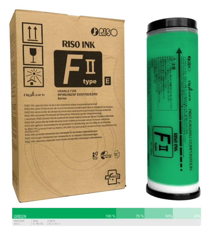 RISO farba FII type GREEN PANTONE KOLOR 354 U Uniwersalność RISO Uniwersalna farba kolor FII do wszystkich modeli RISO. Ekologia Nowy skład farby oparty na oleju z otrąb ryżowych z dodatkiem pigmentu to kolejny krok firmy RISO w dążeniu do wyeliminowaniu przy produkcji sztucznych związków chemicznych i zastępowania ich komponentami