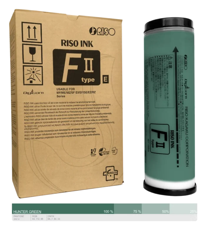 RISO farba FII type HUNTER GREEN PANTONE KOLOR 342 U Uniwersalność RISO Uniwersalna farba kolor FII do wszystkich modeli RISO. Ekologia Nowy skład farby oparty na oleju z otrąb ryżowych z dodatkiem pigmentu to kolejny krok firmy RISO w dążeniu do wyeliminowaniu przy produkcji sztucznych związków chemicznych i zastępowania ich