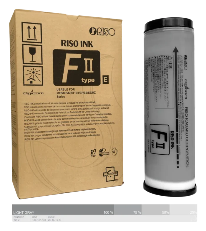 RISO farba FII type LIGHT GRAY PANTONE KOLOR 424 U Uniwersalność RISO Uniwersalna farba kolor FII do wszystkich modeli RISO. Ekologia Nowy skład farby oparty na oleju z otrąb ryżowych z dodatkiem pigmentu to kolejny krok firmy RISO w dążeniu do wyeliminowaniu przy produkcji sztucznych związków chemicznych i zastępowania ich