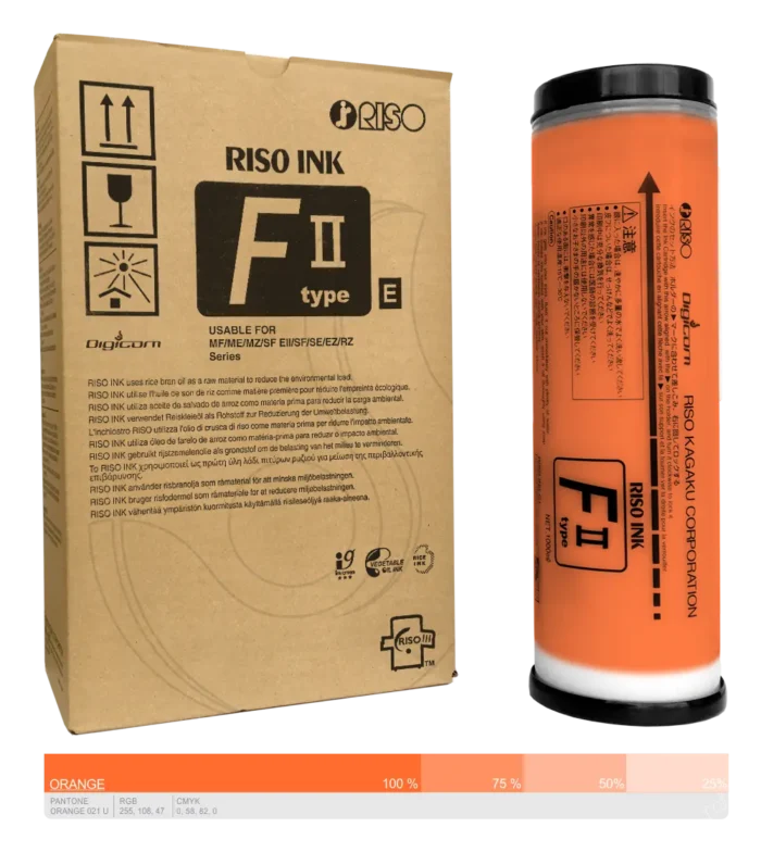 RISO farba FII type ORANGE PANTONE KOLOR 021 U Uniwersalność RISO Uniwersalna farba kolor FII do wszystkich modeli RISO. Ekologia Nowy skład farby oparty na oleju z otrąb ryżowych z dodatkiem pigmentu to kolejny krok firmy RISO w dążeniu do wyeliminowaniu przy produkcji sztucznych związków chemicznych i zastępowania ich komponentami