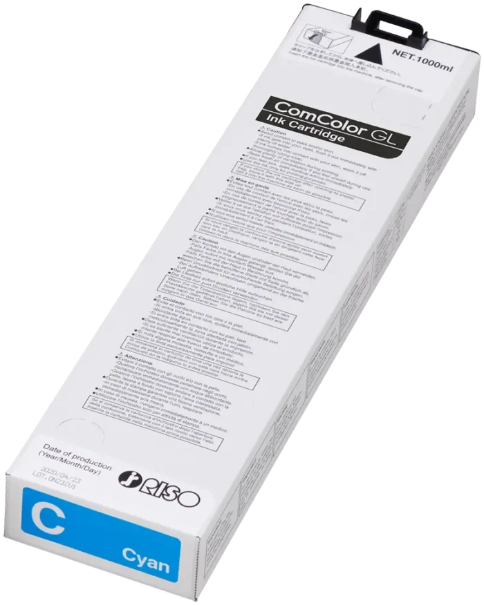 RISO ComColor GL ink Cyan Zastosowanie RISO ComColor GL ink Cyan (S-8447E). Wodoodporny tusz do drukarek atramentowych ComColor serii GL w kolorze cyan. Charakterystyka Nowy rodzaj zastosowanego atramentu oraz poprawiony algorytm druku pozwala na wydruk bardziej nasyconych kolorów oraz obniża czas schnięcia tuszu, co pozwala zwiększyć szybkość pracy urządzeń. Atrament